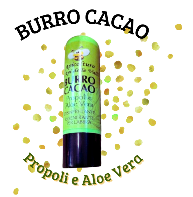 burro di cacao arricchito con propoli e aloe vera ha una formulazione cosmetica che combina ingredienti naturali per offrire benefici idratanti, rigeneranti, disinfettanti e lenitivi alle labbra.